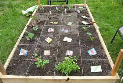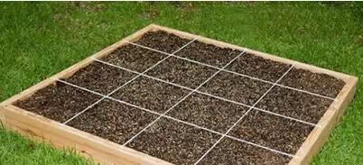 将木板条或绳子固定在木框上,将小菜地划成4行4列,总共16小格。注意木板条或绳子只是把菜地表面划成格子,并没有把下面的土隔开。