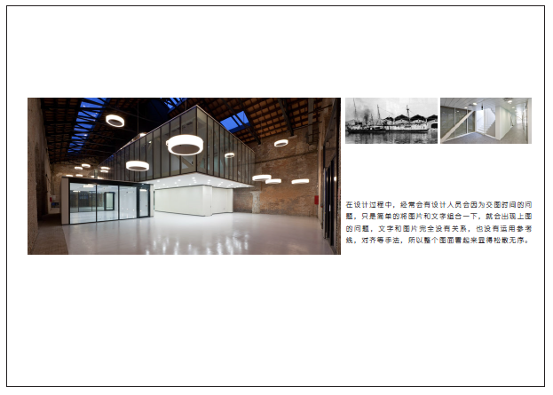 其他字体 除了宋体和黑体外,还有许多其它具有代表性的字体,如“楷书”充满古典韵味,中规中矩;“行书”属于快速书写的字体;“圆体”是将黑体笔画两端的方角改为圆角。 排列对齐好的设计作品在于是否连1厘米以内的细节都要深思熟虑,运用排列、对齐等手法使设计恰到好处。若是没有这种意识,版面看起来总感觉松散凌乱。在作品的整个篇幅中,都应该做到对齐一致。我们一般都会把文字和图片作为主要的构图元素,为了使整体版面显得理性而有条理,文字一般会选用双向对齐。 在设计过程中,经常会有设计人员会因为交图时间的问题,只是简单将图片和文字组合,这样就会出现上图的问题:文字和图片完全没有关系,也没有运用参考线、对齐等手法,所以整个图面看起来松散无序。