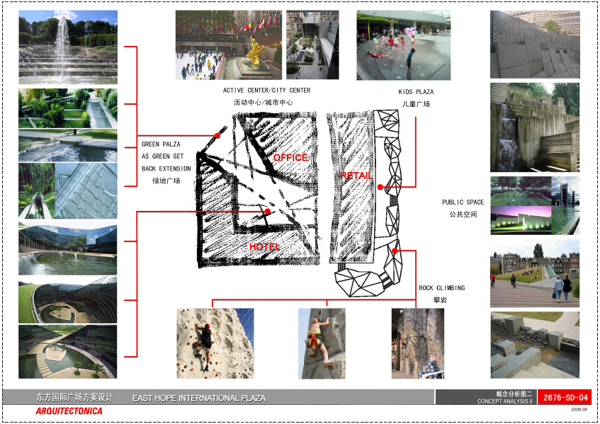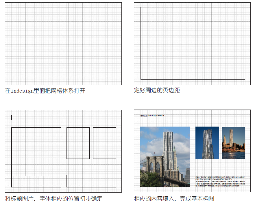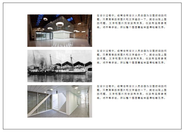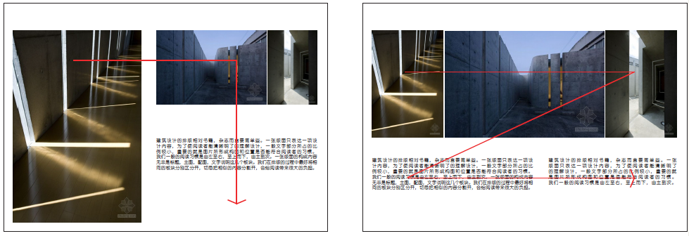 当然,这只是设计的基础手法,想让文本更具表现力,应该是在这个网格系统下创造更多变化。 阅读习惯建筑设计的排版相对书籍、杂志而言要简单些。一张版面只表达一项设计内容,为了使阅读者能清晰明了的理解设计,一般文字所占比例较小,重要的是图片所形成的构图和位置是否能符合阅读者的习惯。