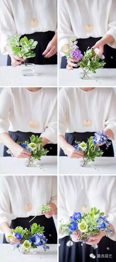 准备鲜花 我们需要白色和紫色的花朵,以及绿色的枝叶做装扮,包括毛茛属植物、飞燕草、蓟花、树枝、象牙金丝桃属植物的浆果。 其他材料 短口玻璃花瓶、剪刀或花剪 制作方法 1.在花瓶中加入至少3cm的清水,备用; 2.修剪花朵和树枝的枝叶,剪掉下面的叶子,不要让叶子泡在水里,这样容易腐烂; 3.修剪花枝长度,通常这样的插花都会让枝叶长度在6-7cm 4.将准备好的花枝依次拿起来,让花束的颜色穿插,通常先拿较大的枝叶,然后用细小的花枝填补; 5.将整理好的花枝放入花瓶中,调整一下位置和角度,让左右看起来平衡; 6.哪里有不平均的,用小的花枝再次填补。