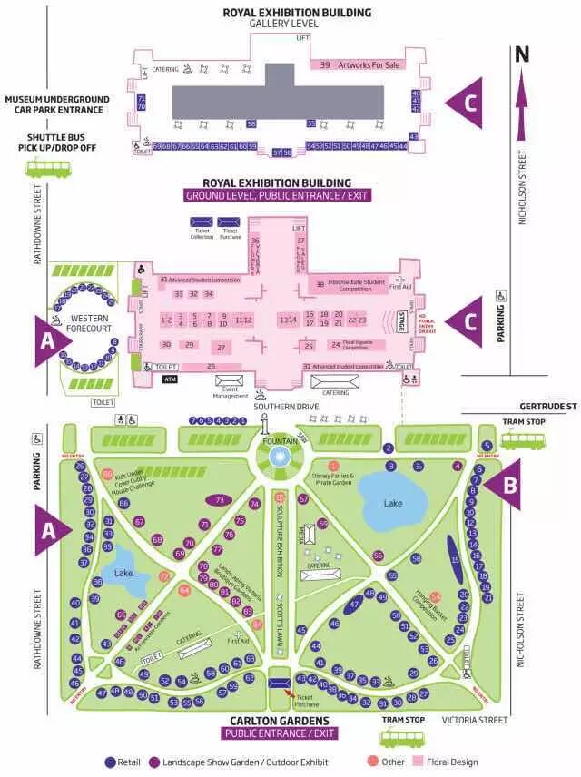 导览图和介绍资料可以在花展入口附近的信息处免费领取,也可以通过花展的官方网站和相关新媒体宣传渠道下载。图片中粉红色块显示的长方形区域是花展的室内展区。室内展区设在被列入世界物质文化遗产的墨尔本皇家展览馆内(Royal Exhibition Building)。这里的展出内容包括大型花艺作品展示、现场插花创作比赛、花店陈设展示、玫瑰花展、盆栽鲜花绿植和鲜切花售卖等单元。