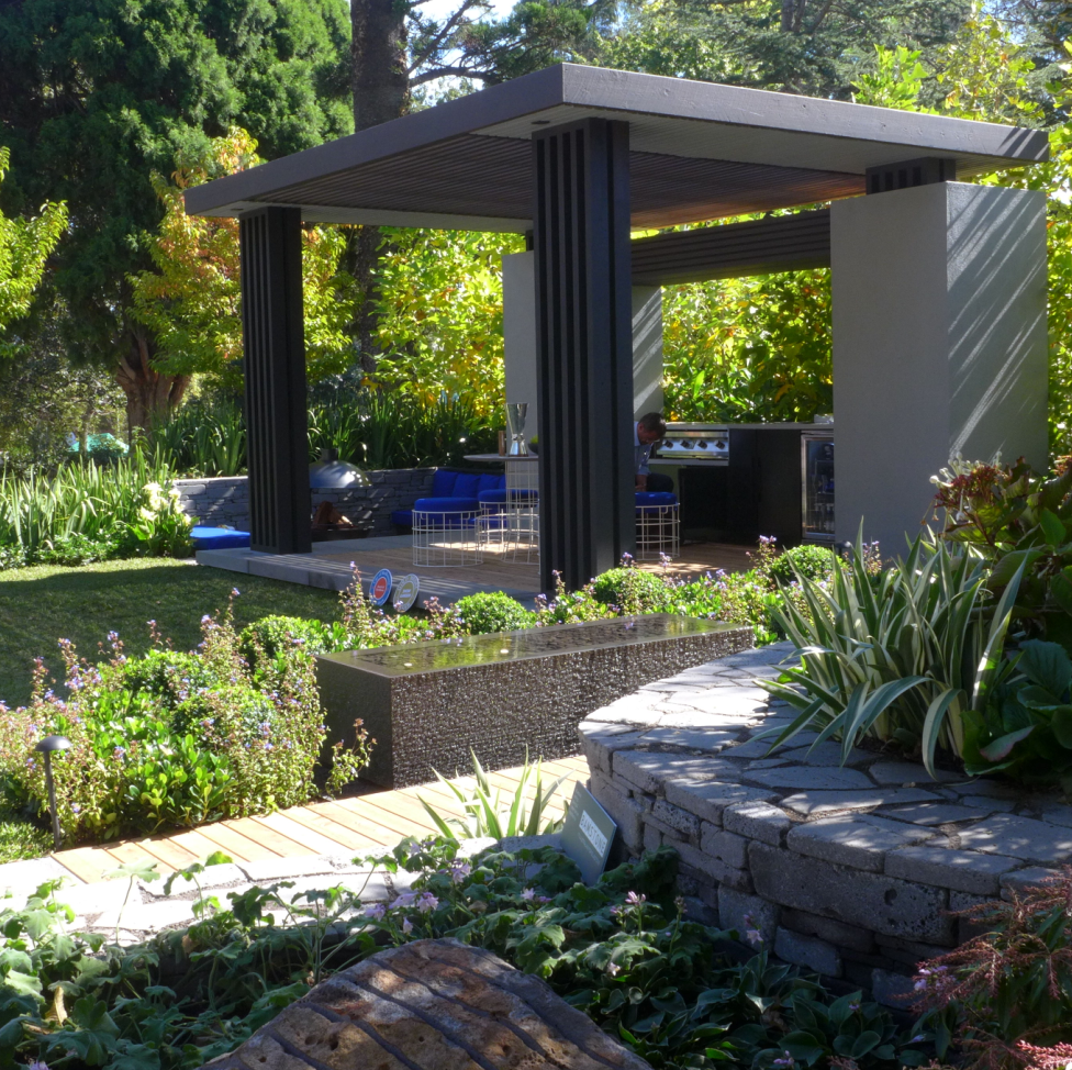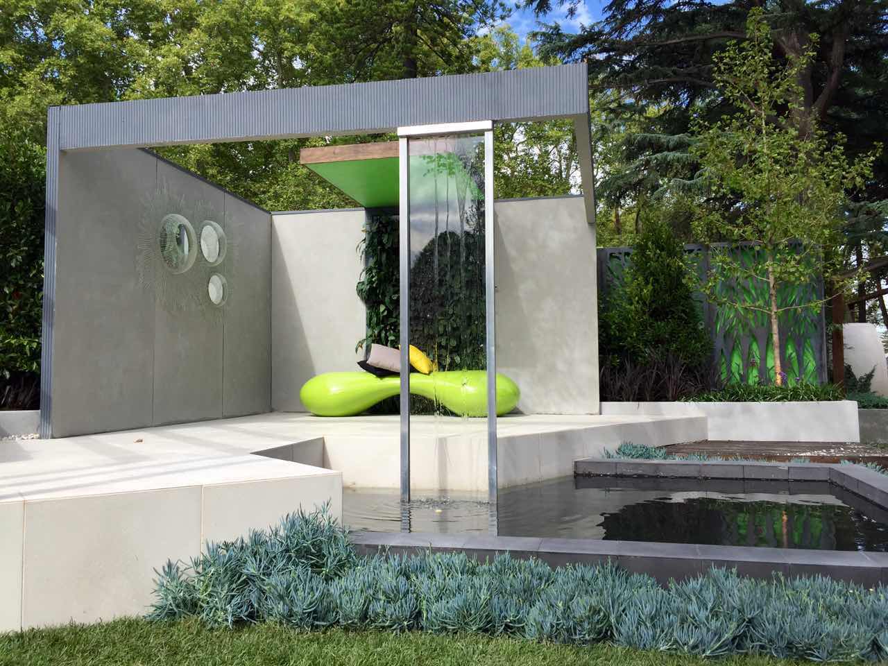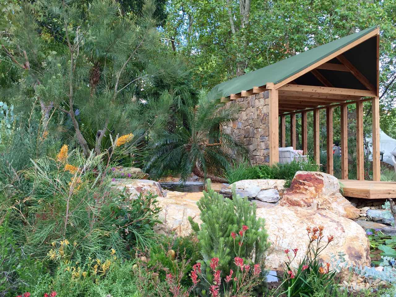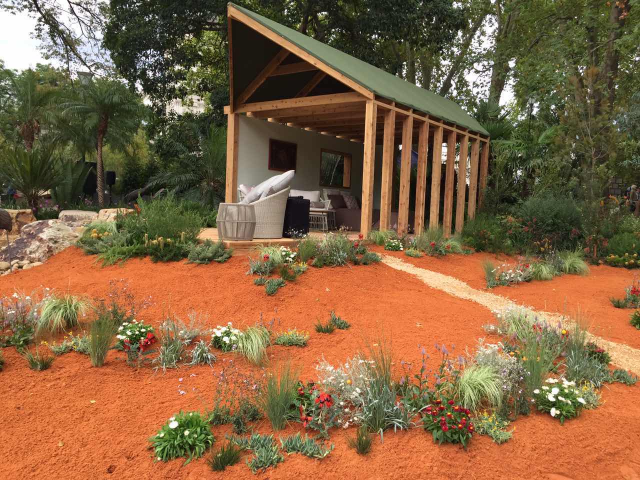 最让人期待和瞩目的环节——景观花园设计作品展。二十几个由专业设计师精心设计和打造的花园分布在展区中心道路两侧。这些花园各有姿态,错落有致地依着卡顿花园缓坡的地形,映衬着园中的大树,仿佛它们天生就存在于这儿,而不是在11天时间内搭建起来,在五天后就将永远消失的花园。Wellness Garden的设计师Christian Jenkins这样回答我们的提问:“可以说我设计和搭建这座花园只用了一个月的时间,也可以说我用一生来建造这座花园,它体现了我所有的学习、积累和感悟。”或许正因如此,在为这些花园惊艳的时候,人们也忘记了其实它们只是展品。我们看到了堪称现代花园典范的大型花园、生机勃勃的香草果蔬花园、热带风情的瀑布园、小桥流水的东方庭院……没错,它们就是真正的花园! 花园景观设计秀,体现的是近期园艺设计的主流趋势,带给园艺从业者和观众以设计理念方面的启示。这些年来,更多的花园都将园中的休憩空间作为必要元素,园艺与家居更趋融合,花园越来越生活了。今年的花展不仅在花园中看到沙发、茶几、靠垫、滑梯和取暖器,我们还在香草果蔬花园中看到了设施完整的灶台和炊具,操作台和烧烤炉,还有一个摆放好全套餐具,只等你入席的餐桌。晒着暖暖的太阳,闻着草木的芳香,需要什么香草伸手即可就地取材……生活可以是一支田园牧歌。